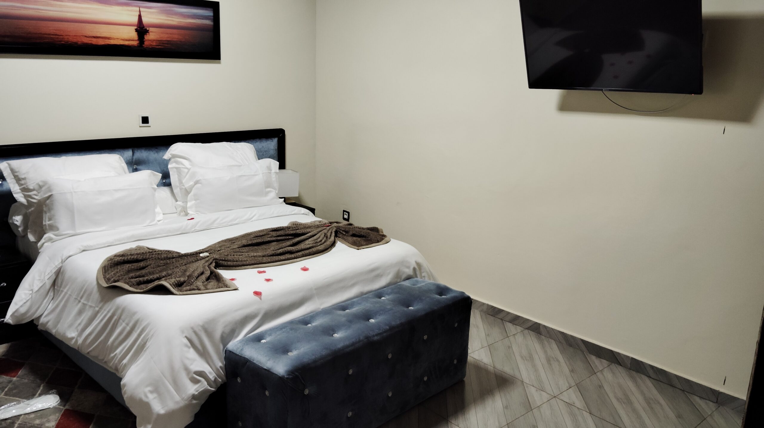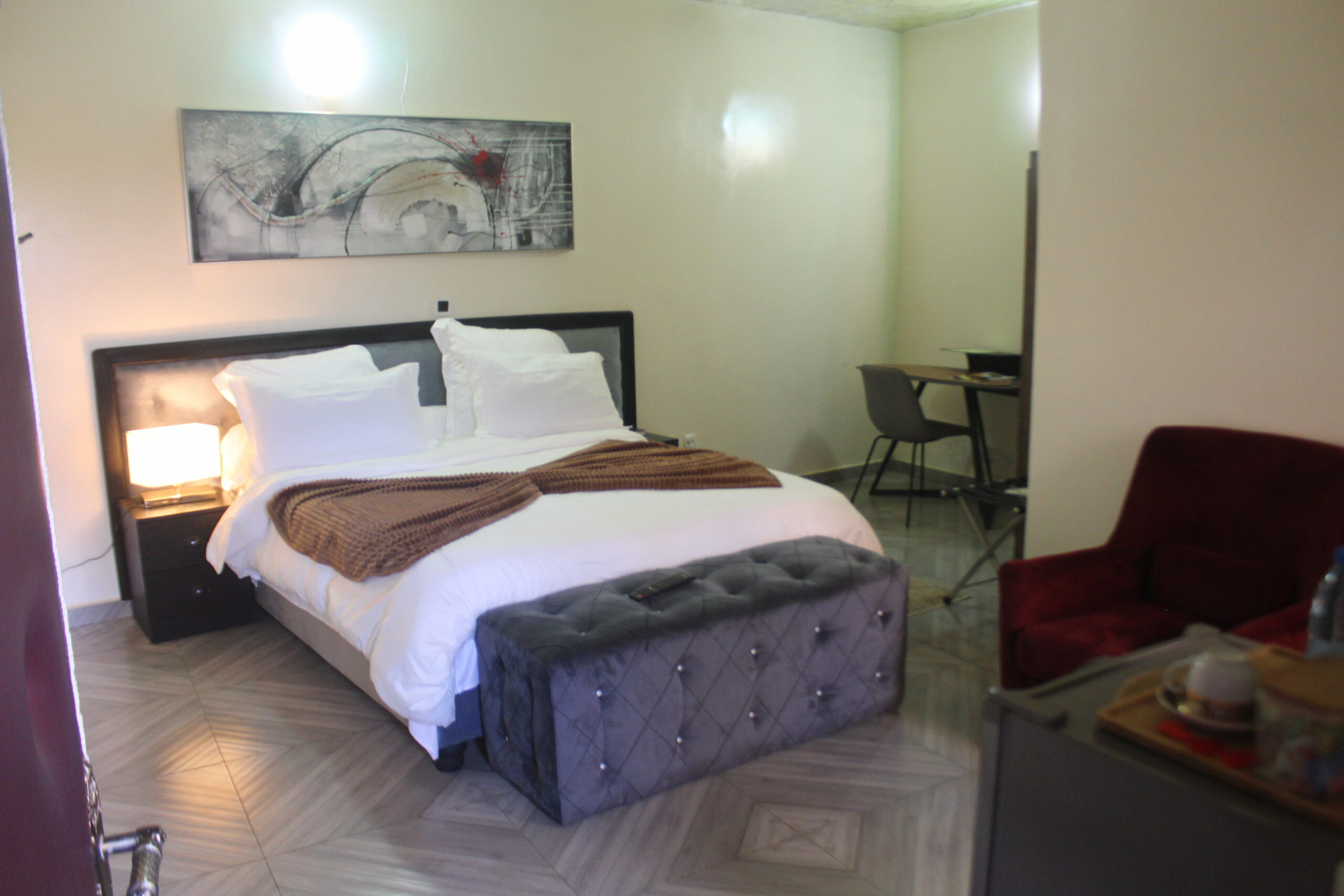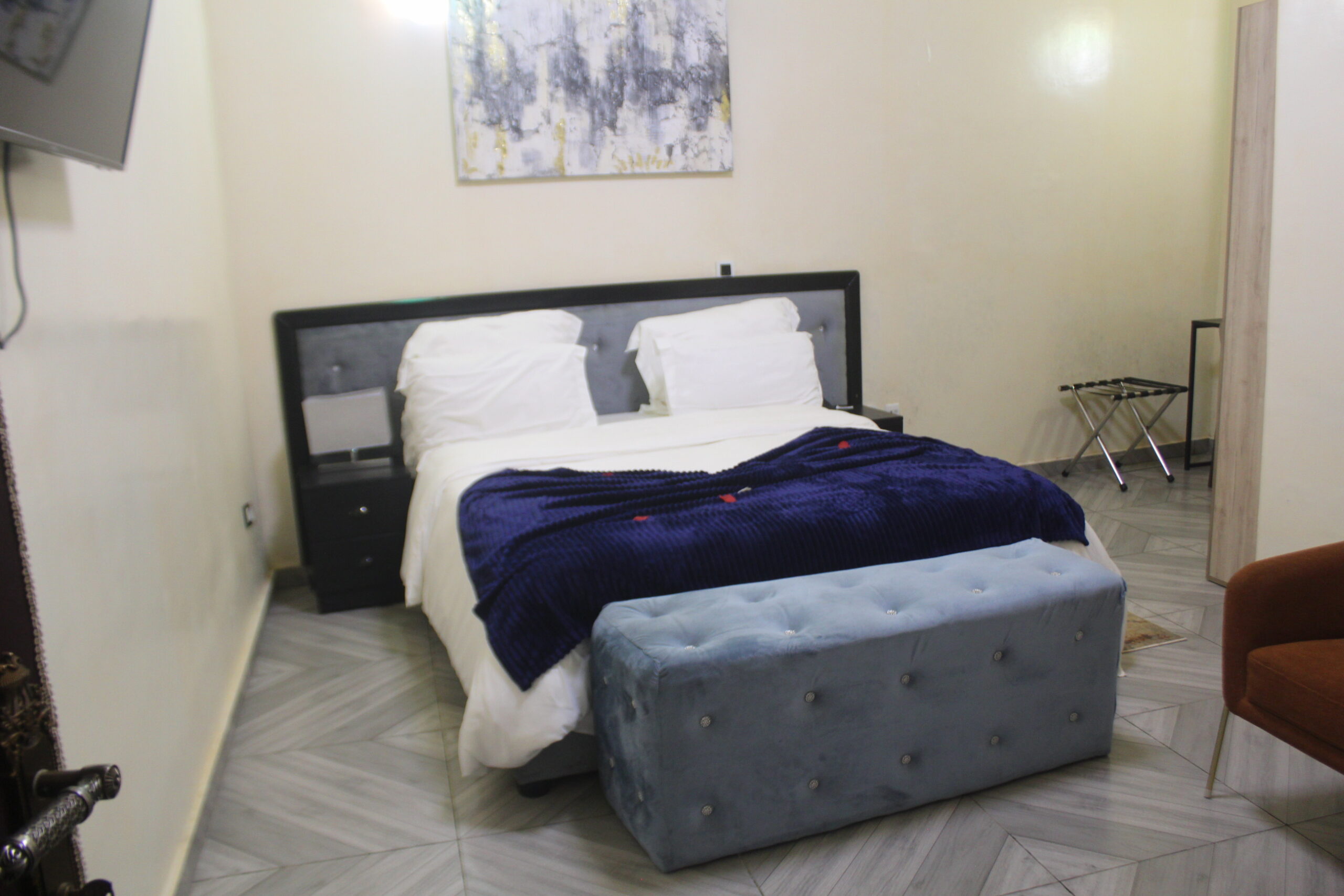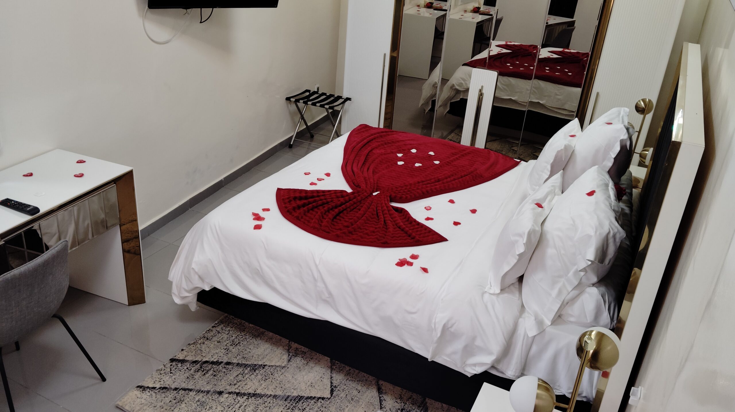 - Équipements : accessoires de toilette, Climatisation, douche + toilette avec eau chaude, Ecran TV 43 pouces avec tout Canal +, Frigo, Piscine, Placard de luxe, Plateau de courtoisie, Wifi